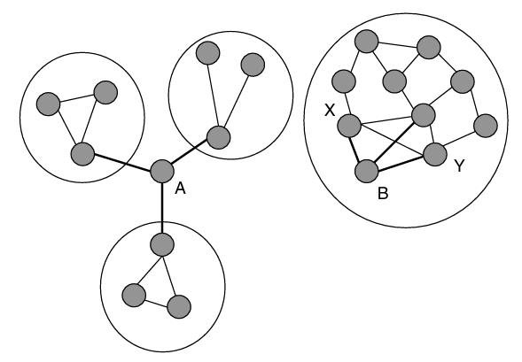 图 3 节点A比节点B的自我网络拥有更多结构洞