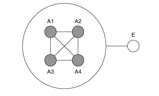 此外,作者还提到“虚拟联合”(virtual amalgamation)概念,即若多个弱势节点之间存在团结关系(如工会成员),它们可以协同行动、联合对抗强势节点。如图6所示,若 A1-A4 彼此团结,就能与 E 平等博弈,这就是协调性关系所带来的组织优势。