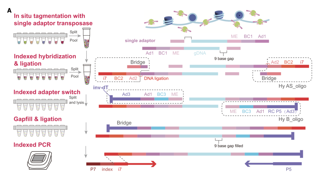 图1(原图1A) UUATAC‑seq 的实验流程与“四轮池拆条码”设计,高效完成单细胞染色质检测。第一步,利用特殊的酶给每个细胞的DNA打上初始标签条码;第二步,细胞混合后,再给每个细胞添加一个独特标签;第三步,通过温度控制的方式精确加入第三个标签;最后一步,通过DNA扩增加入第四个标签,完成单细胞水平的染色质分析。