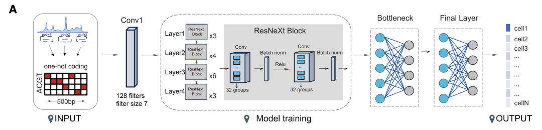 具体而言,女娲CE模型采用了多任务深度学习架构(图2),其核心结构由卷积网络CNN与残差网络ResNeXt组成,能够有效捕捉DNA序列中复杂的模式特征与多尺度信息。模型以固定长度(500 bp)的基因组序列为输入,经卷积层和瓶颈层的特征压缩后,最终输出这段序列在数万个单细胞核内处于染色质开放状态(调控元件活跃)的概率。