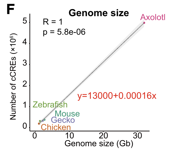 图3(原图4F)展示了脊椎动物基因组规模(Genome size)与候选顺式调控元件数量(Number of cCREs)之间显著的线性关系,揭示了不同物种基因组中,调控元件数量随基因组规模扩增而稳定增加的规律。