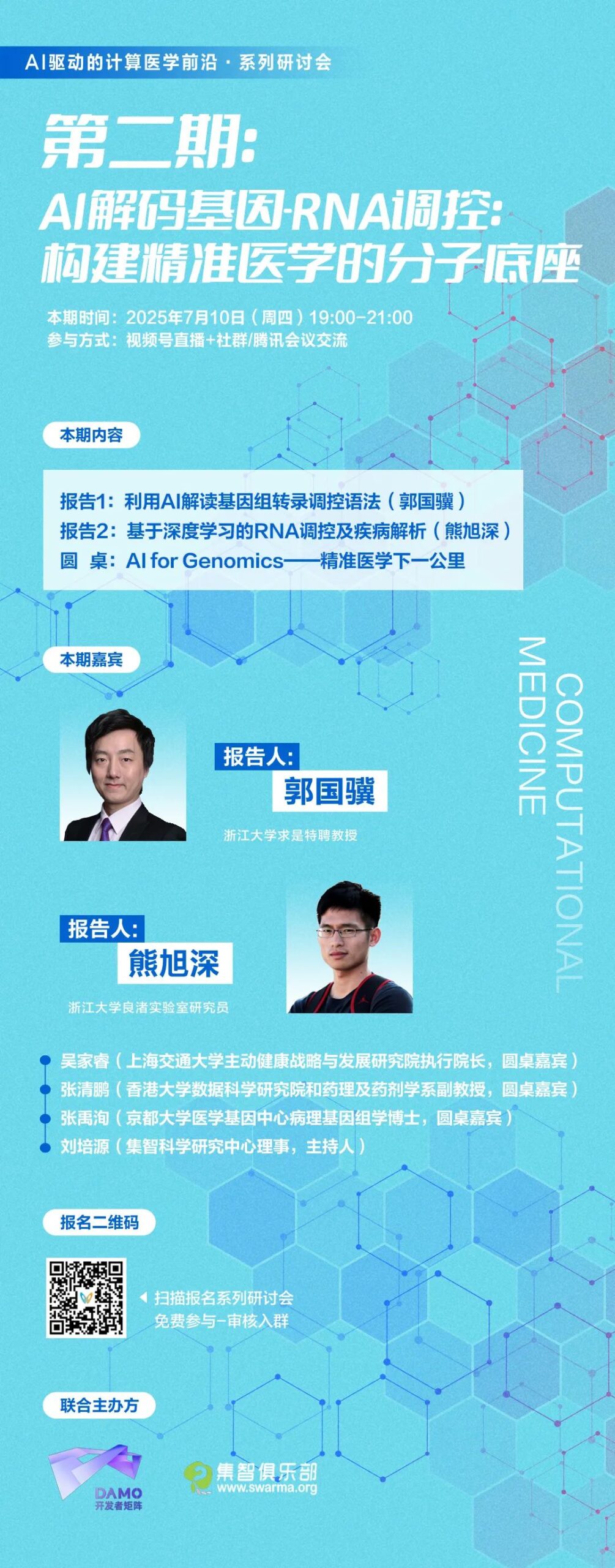 7月10日(周四)19:00-21:00,我们特别邀请到郭国骥老师在“计算医学研讨会”第二期活动中分享这一最新研究成果。“AI驱动的计算医学前沿:从科学发现到数字孪生”系列研讨会由DAMO开发者矩阵与集智俱乐部联合主办,深入探讨AI与生物医学交叉的最新进展。