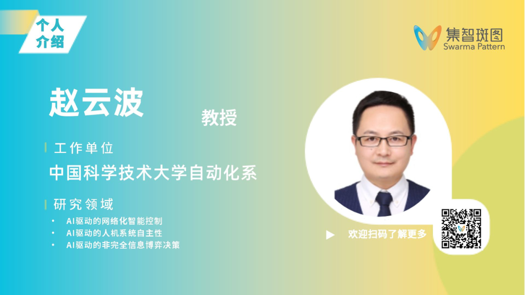 赵云波,中国科学技术大学教授、博士生导师,合肥综合性国家科学中心人工智能研究院双聘研究员,入选国家海外引才计划青年项目。研究以“AI驱动”为特色,包括AI驱动的网络化智能控制、AI驱动的博弈决策和AI驱动的人机混合智能等方面。发表学术论文100余篇,出版Springer英文专著2部、科学出版社中文专著1部。任多个专业委员会委员和网络化控制学组秘书长等社会职务。