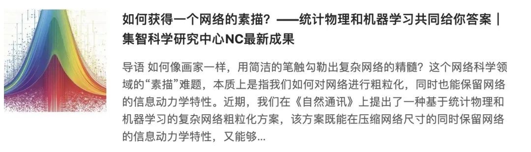 荣英淇: 从本科参与集智读书会、百科译校,到Gap期间入住集智公寓深入研究,合作发表《National Science Review》论文。他深刻体会了团队协作与跨学科的力量,并在集智找到了科研与科普结合的独特氛围和志同道合的伙伴。