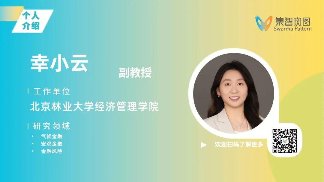 幸小云,北京林业大学副教授,系统分析与集成博士,硕士研究生导师。主要研究领域为气候金融、宏观金融、金融风险等。近五年在《Applied Energy》《Energy》《Research in International Business and Finance》等SCI/SSCI收录期刊发表论文二十余篇。担任《Financial Innovation》《Energy Economics》《Ecological Economics》等国际期刊匿名审稿人。