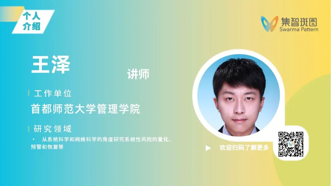 王泽,首都师范大学讲师,管理科学与工程博士,系统科学博士后,硕士研究生导师,北京市总体国家安全观研究中心特聘研究员,北京师范大学政府管理研究院特聘研究员。致力于从系统科学和网络科学的角度研究系统性风险的量化、预警和恢复等问题。主持国家自然科学基金青年项目,北京市社会科学基金规划项目,中国博士后科学基金面上项目各1项,参与国自然重点项目等国家级与省部级项目十余项。累计发表科研论文40余篇(SCI/SSCI论文35篇),Google学术引用800余次,H指数16,i10指数20。担任SCI期刊Frontiers in Physics客座编辑,兼任十余个国内外期刊匿名审稿人,研究成果多次在国内、国际重要学术会议上汇报。