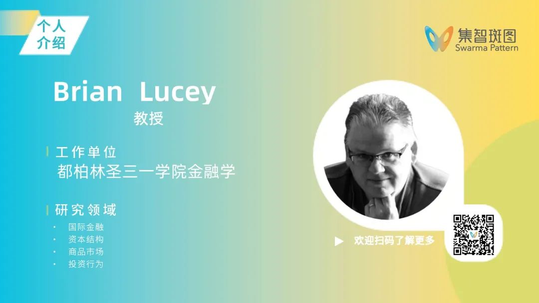 Brian Lucey,爱尔兰都柏林圣三一学院 (Trinity College Dublin) 金融学教授,目前担任SSCI期刊International Review of Economics and Finance,Journal of Economic Surveys主编,曾任SSCI期刊International Review of Financial Analysis,Finance Research Letters主编,INFINITI国际会议发起人及主席。Lucey教授的研究领域主要包括国际金融、资本结构、商品市场、投资行为等,在Journal of Banking and Finance、Journal of Corporate Finance, British Accounting Review等国际学术权威期刊上发表了200多篇高质量学术论文。在加入都柏林圣三一学院之前,Lucey教授曾担任爱尔兰中央银行经济学家和爱尔兰健康与儿童部的分析师,具有丰富的行业研究经历。