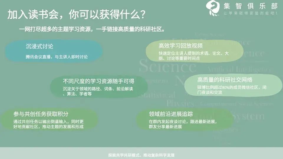 读书会采用共学共研机制,成员通过内容共创获积分(字幕修改、读书会笔记、论文速递、公众号文章、集智百科、论文解读等共创任务),积分符合条件即可退费。