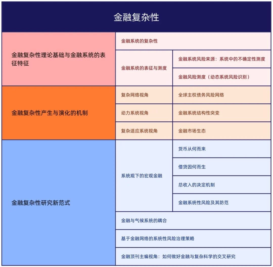 金融系统,包括金融市场以及更大范畴包括金融机构、其他自然和社会因素的扩展金融系统,可以看作一个演化的复杂系统。如何研究这个典型的复杂系统是一个重要的课题。需要我们从各个角度去增进认知,包括了解复杂金融系统的典型特征;探讨涌现这些复杂现象背后的基本微观机制,特别是自组织机制;金融复杂性研究的历史渊源(如自组织理论、非线性经济动力学、复杂适应系统理论、网络科学等)以及主要范式;未来值得关注的研究方向和问题。
