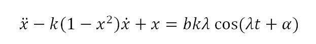 式中k,b,λ,α 为参数。后来知道,这个方程和瑞利勋爵(Lord Rayleigh)的方程是等价的,它还可以看作是阿尔弗雷德–玛丽·李纳德(Alfred-Marie Liénard)方程的一种特别情形。不过,这个方程极限环的存在性是范德波尔在k>0 和b=0 条件下从实验中证实的。在k>0 和 b≠0 以及λ ≠0 即有驱动信号输入时,在某种自然频率下他听到了来自这个确定性系统内部的“毫无规律的噪声”。后来科学家们认识到,这是最早在实验中观察到物理混沌现象的报告。