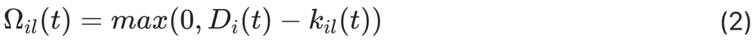 我们假设r是恒定不变的。对于任意企业i,其需求Di表示其需从所有子节点获取的产品总量。注意此处的数量单位是任意的,例如一次需求“1”可能代表从子节点A请求三吨产品、从子节点B请求十克产品。每家企业i可以为其子节点l维持一定库存kil(t),库存上限为s,我们假设所有企业的库存容量相同。如果当前库存kil(t)小于企业i的需求Di(t),则该企业将向其子节点追加订购: