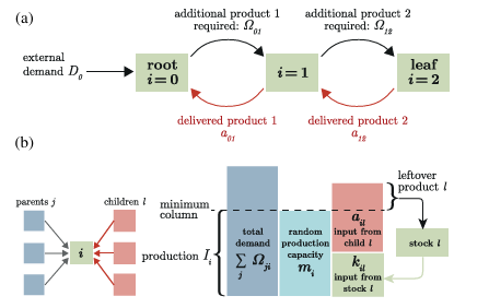 图1:动态机制的示意图。(a)展示了一个小型示例网络,包含一个根节点 i = 0 、一个中间节点 i = 1 和一个叶节点 i = 2 ,图中可视化了需求与产品的流动过程。(b)展示了任意节点i的局部放大图,该节点具有父节点j和子节点l,图中展示了产量Ii如何由需求、随机生产能力mi、来自子节点的交付量ail以及库存kil共同决定。