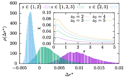 图4:在主图中,我们展示了在不同子节点数z分布下,通过数值模拟得到的临界需求差异Δr*的概率密度ρ(Δr*)(最大库存容量为s=1)。对于每种概率密度,我们生成了8×105棵独立的随机树,并测量了它们各自的临界需求速率r*,从而构建直方图。紫色柱状图对应z∈{1, 2},绿色柱状图对应z∈{1, 2, 3},蓝色柱状图对应 z∈{2, 3}。所有使用的树结构均包含恰好N=63个节点,对应高度h=6。插图展示了在不同最小树结构(仅包含根节点及其z0个子节点,即N=z0+1)下,库存s对生产差异![]()