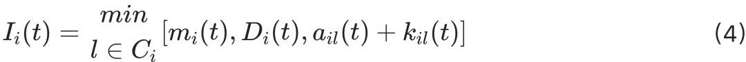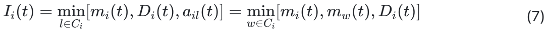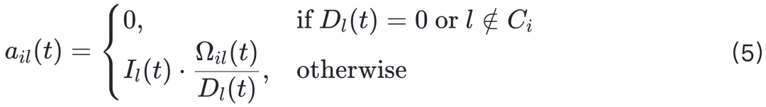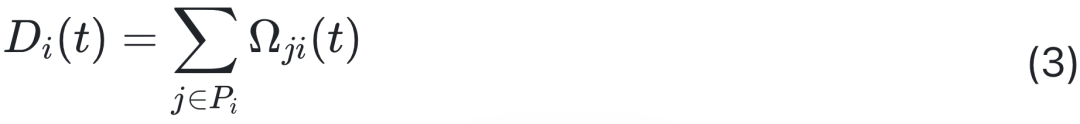每家企业在t时刻能够供应给其父节点(客户)的产品总量显然不能超过其实际产量Ii(t)。如果企业有多个父节点,它需要决定如何将产量分配给各个客户。我们假设这种分配按各父节点在其总需求中的占比进行,即: