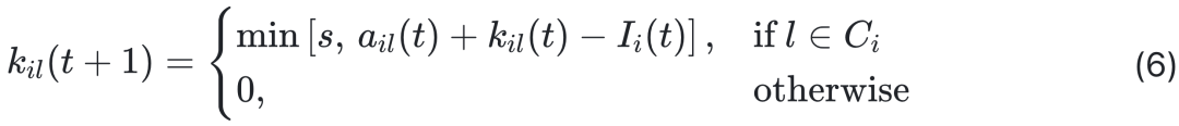 接下来,每个节点i会尝试将未使用的产品继续存储,以供未来使用。由于每类产品的最大库存为s,因此更新规则为: