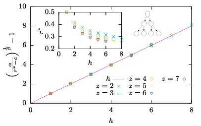 图3:我们在此展示了通过将公式 (12) 拟合到不同正则树结构(由子节点数z和高度h定义)下数值测量得到的临界需求速率r*所获得的数据坍缩结果。所有拟合的决定系数R2均大于 0.999。图中所示的小型网络是一个视觉辅助,用于表明本图描述的是树状结构。插图为完整起见展示了r*随h的变化情况。