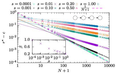 其中α、β和c为拟合参数,依赖于库存容量s。图 2 展示了这一结果。为减小有限规模效应,我们仅使用N≥400的数据进行拟合。