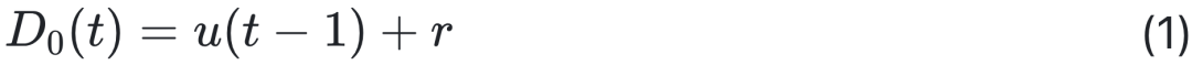我们提出的基本假设是:物料流动网络可以表示为一个有向无环网络(Directed Acyclic Network) [14–17]。这意味着网络中不存在任何节点能够成为其自身的祖先(详见[20])。值得注意的是,这一假设排除了诸如回收、翻新等具有反馈路径的过程 [18,19]。整个网络拓扑结构由一个包含N个节点(企业)的列表来表示。每个节点i都有一个“父节点列表”Pi(即其直接客户)和一个“子节点列表”Ci(即其直接供应商)。我们关注某一特定产品的流动,该产品仅由唯一的根节点企业i=0生产并销售给外部客户。该根节点是网络中所有其他节点的共同祖先。它面临一个外部需求D0,即来自最终客户的订单量。在每一个时间步t,根节点的需求D0(t)由前一时间步未满足的需求u(t−1)和当前新增的固定需求r组成: