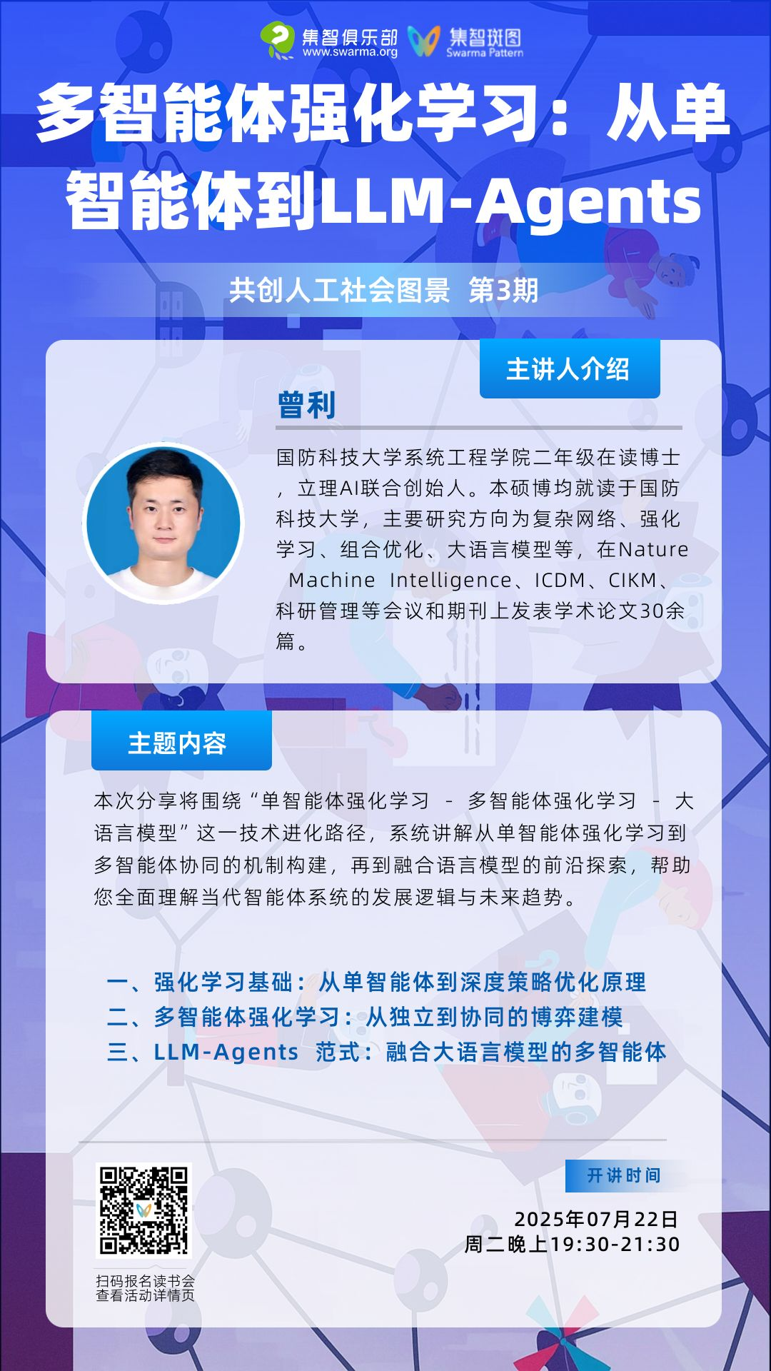 本周是读书会的第三期分享,曾利博士将围绕强化学习从单智能体到深度策略优化的核心原理,解析状态、动作等概念及 DQN、PPO 等算法构建;深入多智能体强化学习范式,剖析非平稳性等挑战与主流模型机制;探讨融合大语言模型的多智能体建构,解析 LLM 引入路径与未来范式,展现从基础到前沿的技术演进与应用实践。
