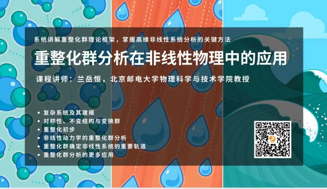集智学园专门打造了一门为复杂系统研究打造的跨尺度分析课程——《重整化群分析在非线性物理中的应用》,由北京邮电大学兰岳恒教授讲解,会系统讲解重整化群这一理论框架,怎样用来分析高维非线性系统的性质,实现方程的求解与约化,更好理解复杂系统。课程将于本周六(7月26日)开启,现在加入可享早鸟价。