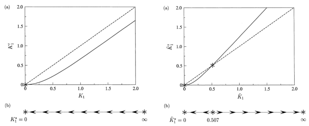 那么,我们已经得到什么样的规律呢?既然他是一个动力系统,就可以用一个相图来表示,图2分别是 Ising model 1d 和 2d 为例的重整化方程相图。1d情况下没有非平凡的不动点(fixed point),2d时则存在一个非平凡的不动点。而参数空间的不动点意味着在尺度变化的过程中,系统的的参数不发生变化。这其实是一个挺奇怪的现象,意味着粗粒化的过程不会本质改变系统内元素的相互作用基本规则。这只有两种场景才有可能发生: