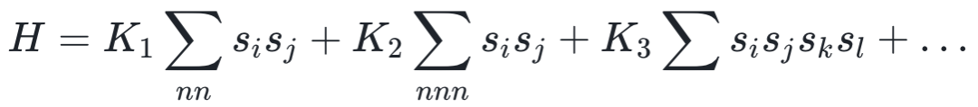 实际上,还有一个容易被忽略但也很关键的细节,就是在刚刚讨论过程中我们提到重整化群的假设是不同尺度的动力学f和f’基本一致。实际上我们在Ising model的例子中,微观尺度的耦合强度是一阶最近邻相互作用,重整化一次之后会出现更高阶的相互作用,耦合强度K的变化不仅仅是简单数值的变化,其实更精确的表述还涉及到维度的扩展。所以图2右边的相图,其实是更高维动力系统的一个降维。也就是说,这里的耦合强度K其实应该是一个无限维向量,包含了多种类型的相互作用K=(K1, K2, K3,…),其中K1是最近邻相互作用常数,K2是次近邻,K3是三个邻居,以此类推。其能量函数形如: