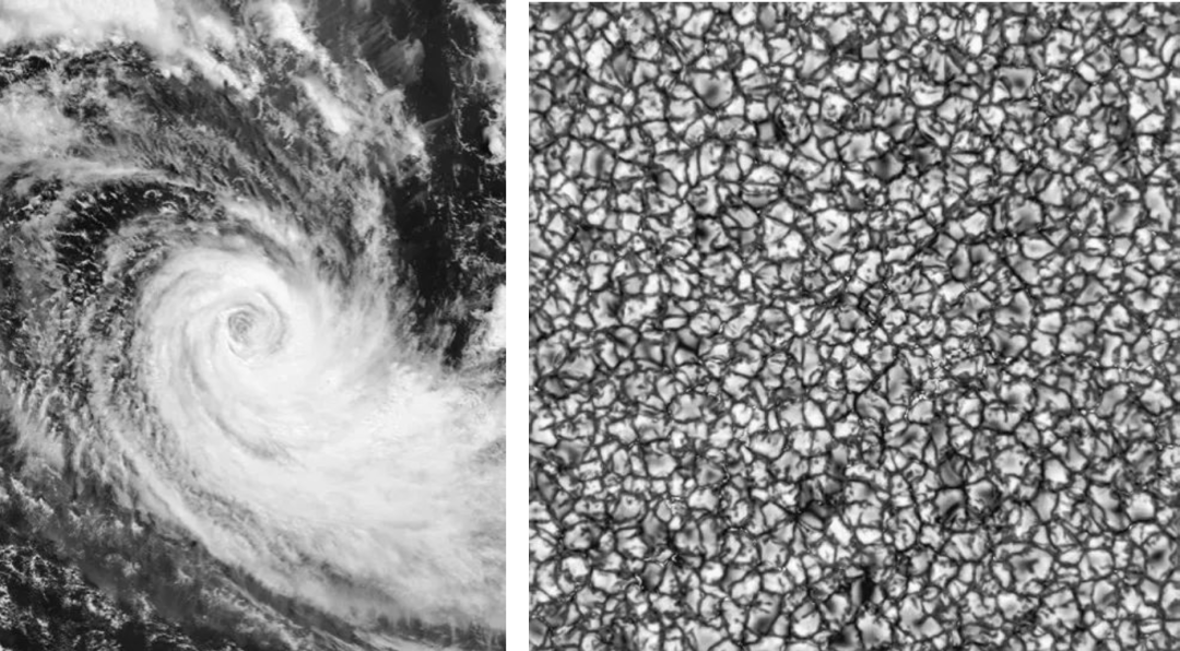 图9-1 混沌中的结构。左图为飓风,右图为太阳表面的对流元丨图片来源:左图来自NASA;右图来自NSO/AURA/NSF,井上建太阳望远镜。
