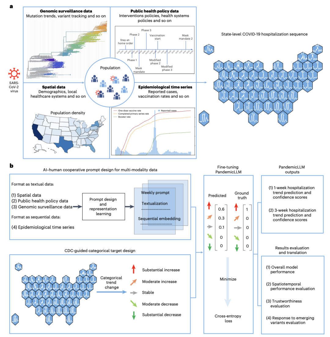 对正在爆发的传染病短期传播进行预测,面临着参与因素复杂且相互关联的挑战,这些因素既包括多模态变量,也涵盖公共政策与人类行为的交互影响。本文提出了一种名为 PandemicLLM 的框架,该框架基于多模态大语言模型,将实时流行病预测重新表述为文本推理问题,并能够整合实时、复杂且非数值化的信息。研究通过人工智能—人类协同提示词设计与时序表示学习,实现对多模态数据的编码。以COVID-19疫情为应用场景,PandemicLLM利用公共卫生政策文本、基因组监测、空间与流行病学时序数据进行训练,并在美国50个州开展了为期19个月的测试。结果表明,PandemicLLM在整合异构信息来源方面具备独特优势,且相较现有模型展现出显著性能提升。