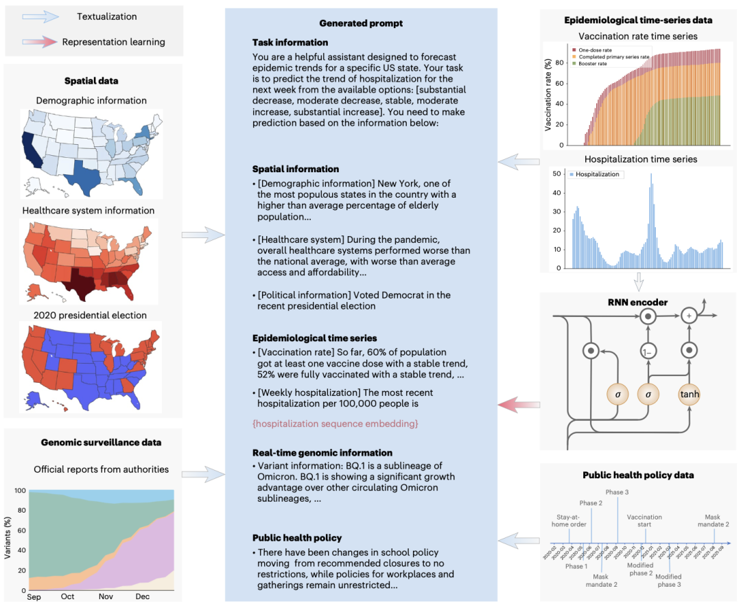 面对复杂多元的疫情数据,研究团队提出模型PandemicLLM,将传统的数值预测问题转化为LLM擅长的文本推理任务。首先,通过人工智能—人类协同提示词设计(AI–human cooperative prompt design),将空间、流行病学时序、公共卫生政策及基因组监测(genomic surveillance)等多模态数据,统一转换为自然语言描述(图 1a)。随后,采用循环神经网络 RNN 对时序数据进行表征学习,并将其嵌入到提示文本中(图 2)。最终,以LLaMA2为基础模型,通过一系列有监督的微调操作,在“模型生成→概率计算”中,输出未来1周和3周的住院趋势分类预测及相应的置信度。