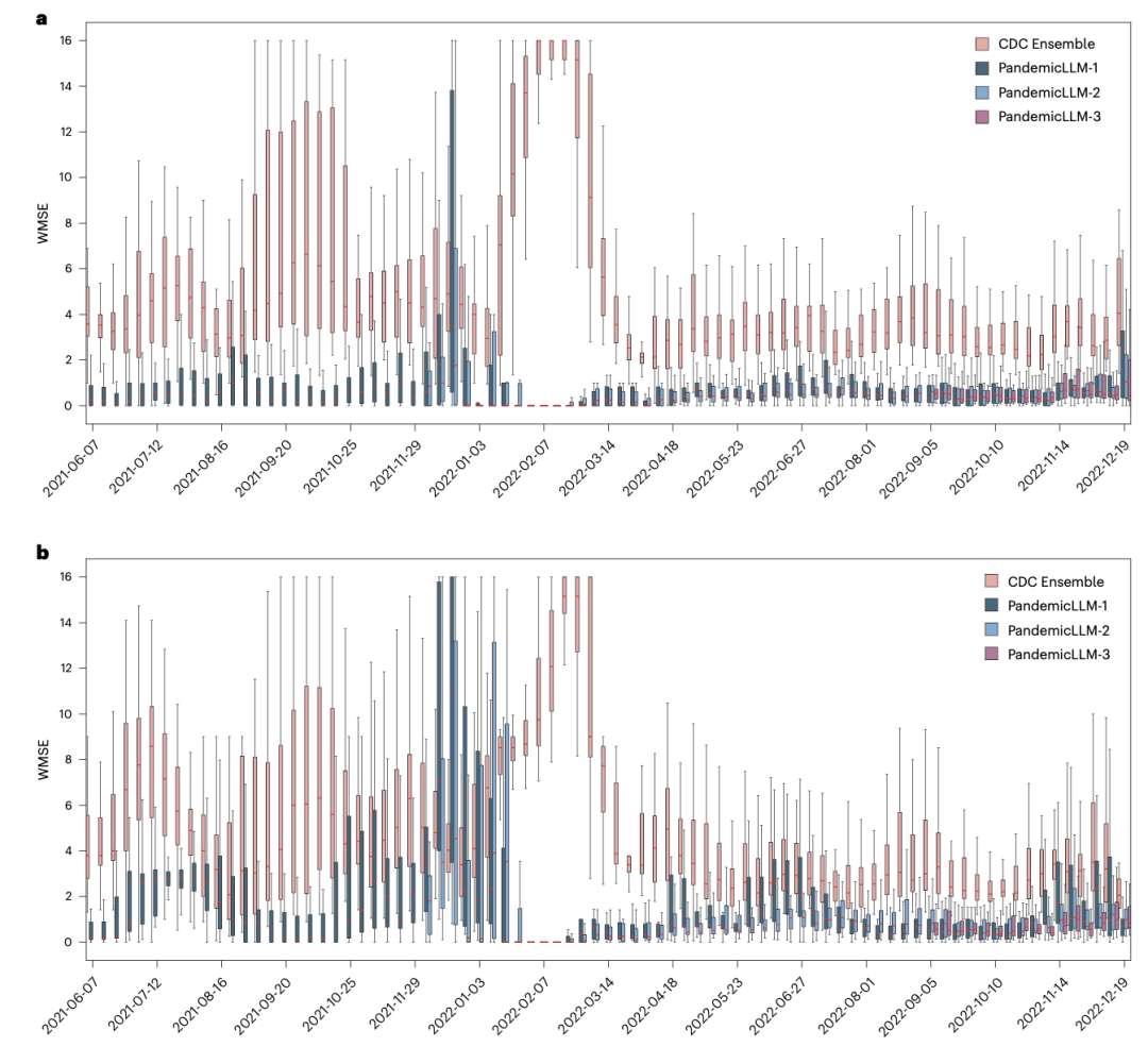 图 3. PandemicLLM模型表现评估。三种PandemicLLM与CDC集成模型的跨时间性能比较y轴表示WMSE的尺度。图中的每组柱状图代表了特定一周内所有50个州的WMSE分布。a、1周预测效果。b、3周预测表现。