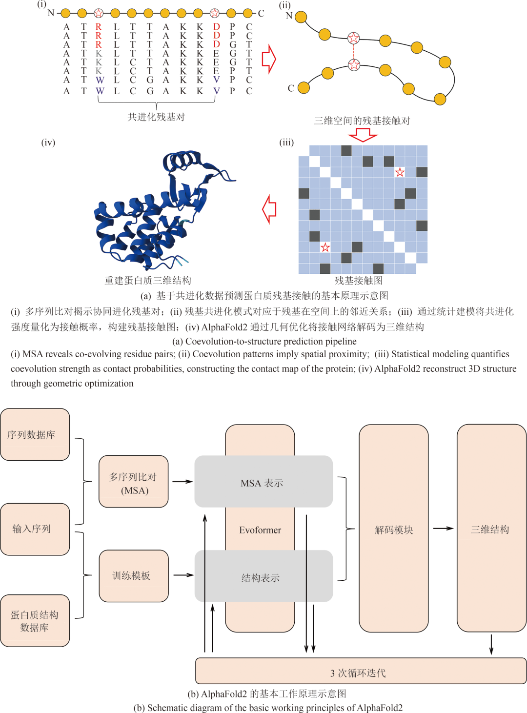 作为蛋白质结构预测领域的里程碑式突破,AlphaFold系列模型的成功源于其对进化信息与深度学习技术的创新性整合。在深入探讨AlphaFold的工作原理之前,有必要回顾其理论基础——基于共进化分析的结构预测方法。共进化分析源于对蛋白质序列中协同突变模式的观察:序列中协同突变的位点在空间上通常紧密接触且存在物理相互作用。如图3(a)所示,当一个残基位点发生突变时,与之在三维空间接近的其他位点往往在进化选择的压力之下需要发生补偿性突变,从而维持蛋白质结构与功能稳定性。这种现象为从序列信息推断结构信息提供了可能性。然而,两个位点的相关性可能源于它们与第三位点的相互作用,而非彼此间的直接物理接触,为解决这一问题,研究者开发了直接耦合分析(direct coupling analysis,DCA)方法。DCA通过统计物理方法分离直接相互作用和间接相互作用,通过同源序列中各位点残基的联合分布推断位点间的直接耦合强度。该方法首先基于多序列比对(multiple sequence alignment, MSA)统计每个位点的氨基酸残基出现频率以及位点之间的残基对组合频率,然后通过最大熵原理构建能重现这些观测频率的最简统计模型,模型中的直接耦合参数反映了残基在三维结构中形成接触的可能性。