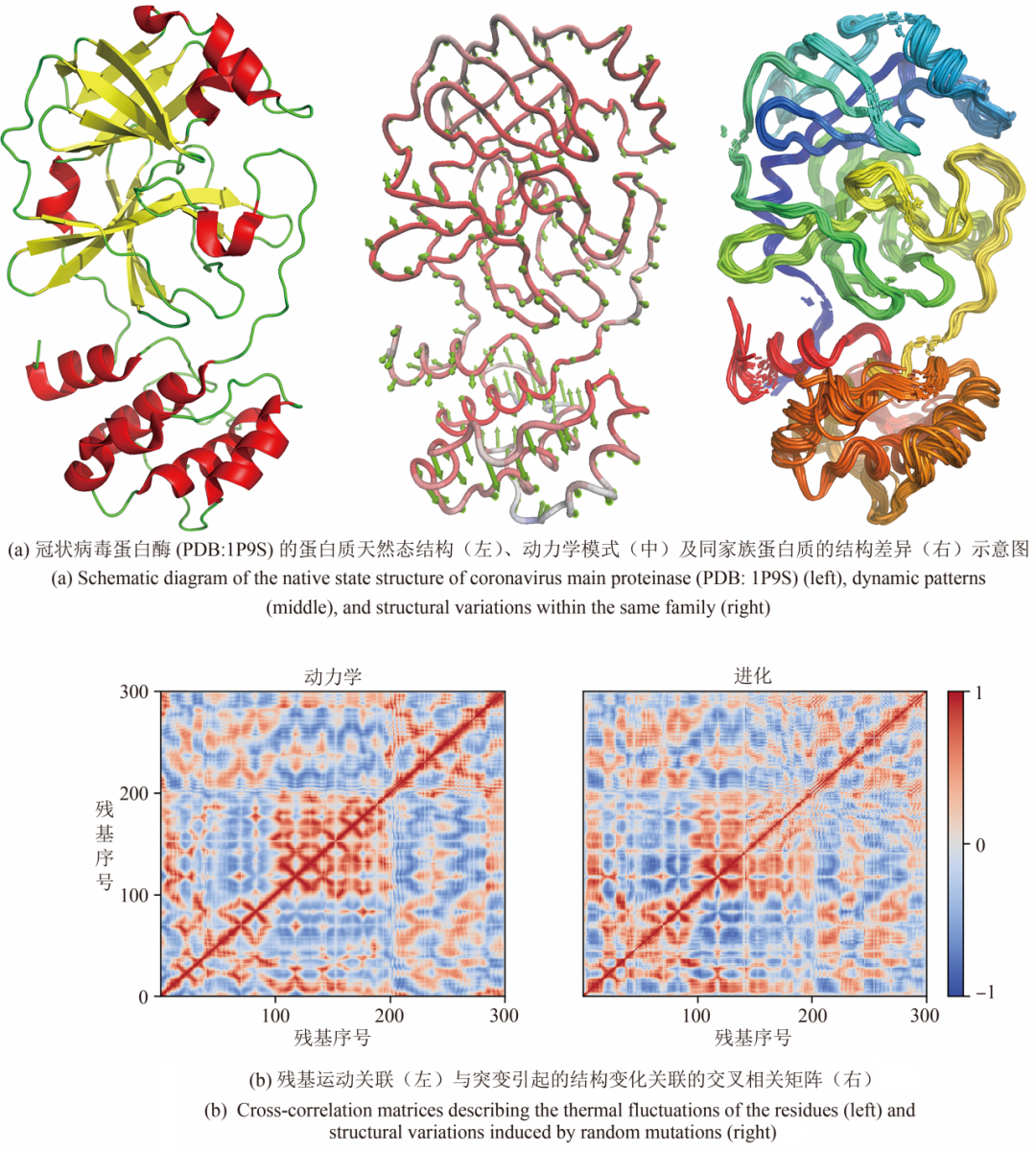 蛋白质的动力学特性与进化过程之间存在着深刻的内在联系,这种联系是理解其生物功能与环境适应性的关键。进化选择了那些动力学特性能够最优支持生物功能的蛋白质序列及其所编码的结构变形,使得蛋白质动力学表现出的结构变化模式与其功能需求达到精确匹配。因此,生物体内的蛋白质展现出如图2(a)所示的两种不同时间尺度下的“变形”机制:在较短的时间尺度上,热力学涨落驱动蛋白质构象在天然态附近发生涨落,这种动力学特性与蛋白质的功能实现密切相关;而在漫长的时间尺度上,氨基酸序列通过突变和自然选择实现进化,导致结构发生适应性改变。尽管这两种过程分别对应着截然不同的时间尺度:前者涉及细胞内快速发生的生物化学反应,维持生命的日常活动;后者则建立在随机突变和自然选择的基础上,需要经年累代的积累。但越来越多的研究表明,它们具有许多相似性:蛋白质热涨落与结构突变都具有一定的低维特征,热涨落幅度较大的残基同样是突变率较高的残基,两种来源不同的结构改变会引起相似的力学性质改变等。一种经典观点认为:蛋白质的三维结构比其氨基酸序列具有更强的进化保守性,这种保守性在蛋白质的核心区域尤为显著。数据驱动方法为揭示蛋白质动力学与进化之间的内在联系提供了新的定量分析视角,对多种蛋白质家族的大规模统计分析还发现,蛋白质的稳定性与进化速度之间存在显著关联,这种关联受到选择压力、蛋白质表达水平等多因素的复杂调控。