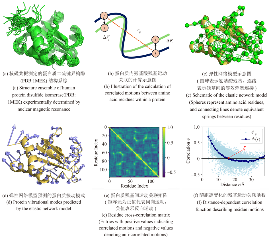 随着大规模蛋白质结构数据的积累,基于统计物理学的研究方法揭示了蛋白质动力学的普适规律,推动蛋白质动力学研究进入定量化、高通量、系统化的新阶段。在蛋白质动力学的刻画中,氨基酸残基的关联运动(correlated motion)描述了残基之间通过协同运动实现功能调控的物理机制。这种关联不仅体现在局域结构的热涨落(如α螺旋的伸缩或β折叠的扭曲)引发的构象变化,而且局域扰动可通过“长程关联”(long-range correlations)传递到空间远端的残基,驱动蛋白质整体构象发生重排。这种跨越空间尺度的动态协同性,是蛋白质执行催化、变构调控、分子识别等多样化生物功能的物理基础。