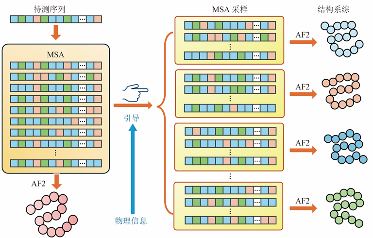 “提示词调整”的基本原理在于,MSA提供的共进化信息是AF2预测天然结构的重要依据。蛋白质的不同构象(即残基不同的接触模式)间接反映的是不同的共进化信息。即使基于相同输入序列, 只要MSA不同(共进化信息不同),AF2仍可预测出不同的构象状态。如图5所示,待测蛋白序列的完整MSA可直接通过AF2生成“标准”预测结构,也可结合物理特征对完整的MSA进行重采样,得到若干MSA子集,对这些不同的MSA子集进行多轮结构预测,可以获得代表蛋白质动态特性的多构象系综。这种思路的物理基础在于:通过筛选或重组MSA中可能相互矛盾的共进化信号,引导模型捕获特定构象的能量面特征。在技术实现上,研究者开发了多种MSA序列调控策略以增强预测多样性,例如欠采样法通过减少MSA序列数量,降低互斥的进化信号,促使AI模型预测出其他构象;AF-Cluster通过将MSA序列聚类,将相互矛盾的共进化信息进行解耦,从而实现对已知变构蛋白不同构象状态的预测。这些方法虽然实现方式不同,但它们都增强了现有AI模型对蛋白质构象多样性的预测能力,为蛋白质构象动态的定向预测指明新的方向。