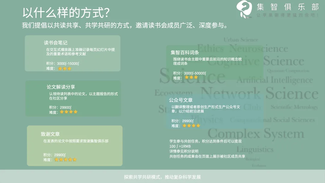 读书会采用共学共研机制,成员通过内容共创获积分(字幕修改、读书会笔记、论文速递、公众号文章、集智百科、论文解读等共创任务),积分符合条件即可退费。