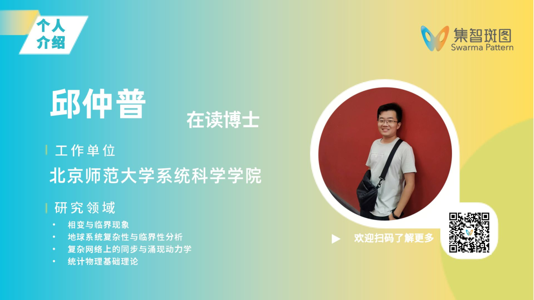 邱仲普,北京师范大学系统科学学院系统理论专业博士生,导师为樊京芳教授。本科就读于四川大学物理学(试验班)专业,曾入选2018年度基础学科拔尖学生培养试验计划(珠峰计划)。