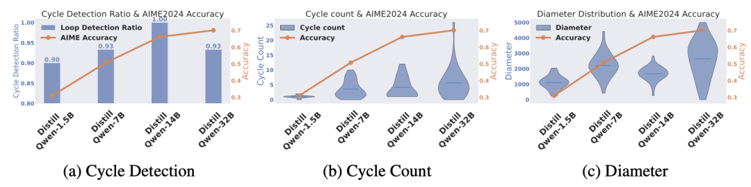 图 4.(a)不同模型尺寸下循环检测率与AIME 2024准确率的关系。循环检测率一般随着模型大小的增加而增加,达到14B,达到100%的循环检测率。然而,准确率最高的32B模型与14B模型相比,循环检测率略低。(b)不同型号的循环次数与准确率之间的关系。较大的型号显示出增加的循环计数,32B模型达到最高的准确率,显示出最多的循环次数。(c)不同模型尺寸下推理图直径与准确率的关系。32B模型,实现最高的准确率,也显示最大的图形直径。