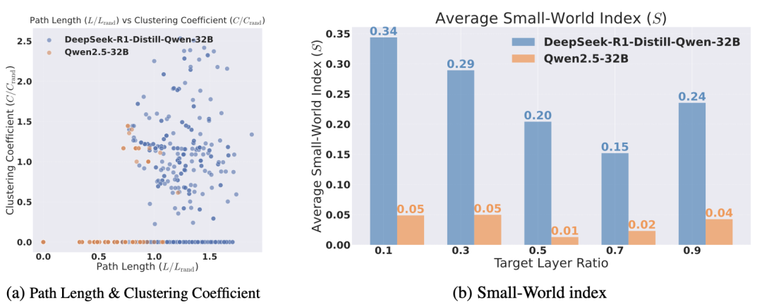 图 3. 大型推理模型(DeepSeek-R1-Distill-Qwen-32B)和基础模型(Qwen2.5-32B)的平均路径长度和聚类系数分布。推理模型具有较大的聚类系数和较长的路径长度,表明推理节点聚类密集但分离广泛。(b)由聚类系数计算的小世界指数与平均路径长度的比较。在所有层中,与基本模型相比,推理模型始终表现出更高的小世界特征。