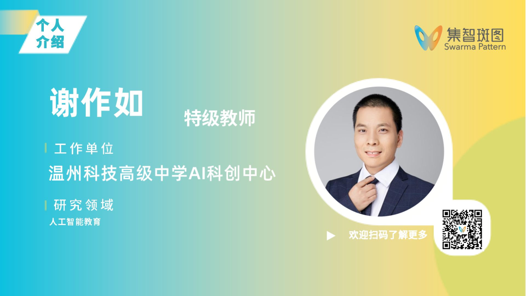 谢作如,温州科技高级中学人工智能科创中心负责人,浙江省“万人计划”教学名师,特级教师,正高级教师(二级),中国电子学会现代教育技术分会副主任委员,中国青少年科技教育工作者协会人工智能普及教育专业委员会委员,教育部综合实践活动课程指导纲要研制项目组专家,教育部“十四五”国培计划专家,中国STEM教育2029创新行动计划专家库成员,中国儿童中心儿童人工智能教育研究院特聘专家,NOAI国际人工智能奥林匹克学术活动中国区科学教育委员会委员、人工智能开源项目XEdu和OpenHydra发起人,清华大学中小学AI通识教材执行主编,2019年联合国教科文组织移动学习周活动特邀发言嘉宾。