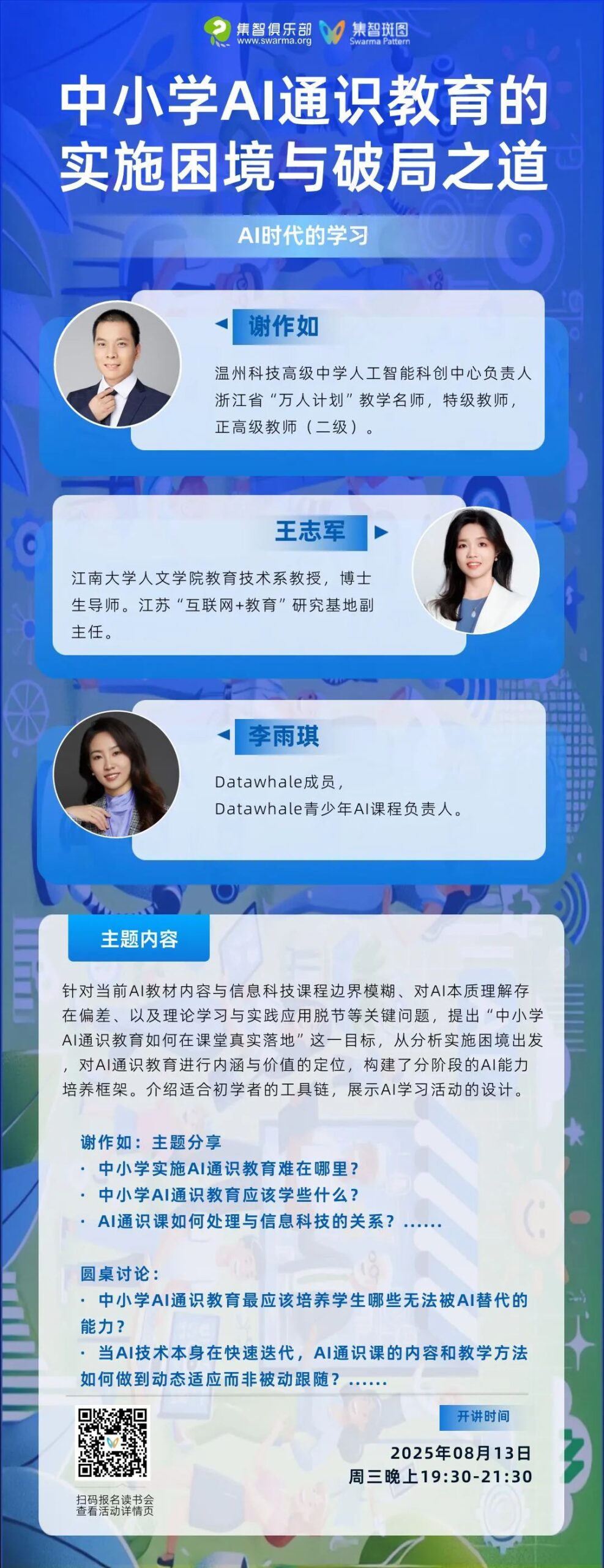 在AI快速发展的时代背景下,中小学如何有效开展AI通识教育,培养学生适应未来社会发展的基本素养,已成为教育界面临的重要课题。中小学实施AI通识教育难在哪里?中小学AI通识教育应该学些什么,与信息科技是什么关系?这些问题一直缺少深度讨论。本次分享的主讲人拥有多种标签,既是拥有三十多年一线教学经验的中小学教师,又曾经担任国家实验室的AI教学平台和工具开发项目的负责人,并且负责多个版本的AI通识教材编写工作。他将从多个角度分享自己的思考。