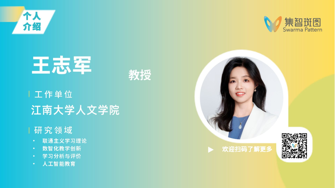 王志军,江南大学人文学院教育技术系教授,博士生导师。江苏“互联网+教育”研究基地副主任,先后入选江南大学至善青年学者、江苏“紫金文化人才培养工程”文化优青培养对象、江苏省333高层次人才培养工程。主讲人一直聚焦于数字文明孕育的新型学习理论——联通主义、数智化教学创新研究。积极推进教学改革和创新,先后主持两项省级教改课题,获第十届西浦全国大学教学创新大赛特等奖,江苏省第五届教学创新大赛一等奖,江苏省高等学校微课教学比赛获一等奖。在中国大学MOOC开设本科在线课程《在线课程设计与开发》,在学堂在线开设研究生在线课程《学习分析与评价技术》。分别与北京师范大学、中国建设银行合作开发国内首门联通主义社区化课程和全球首个联通主义指导的企业培训社区项目。指导发布国内首份《人工智能人才学习白皮书》,并致力于推动中小学人工智能教育发展。