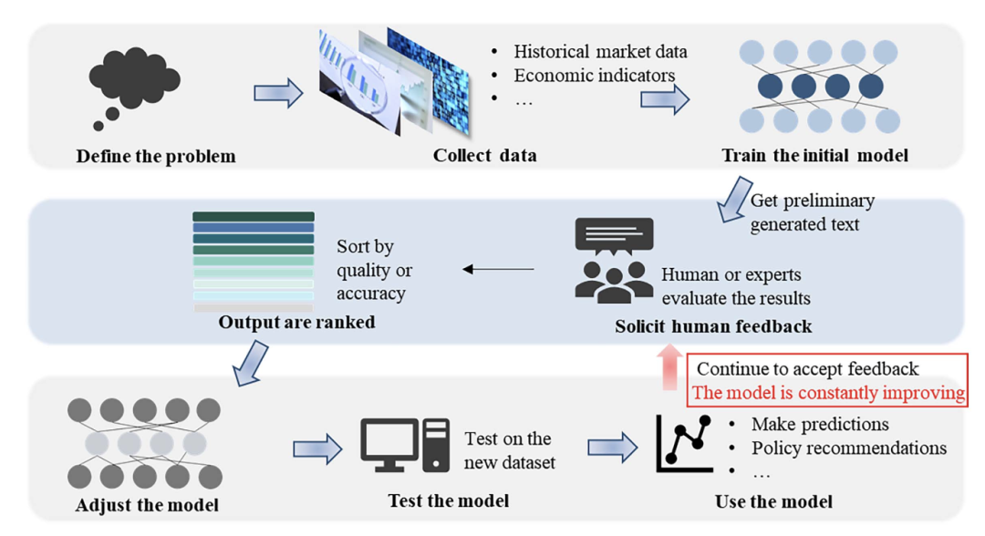 基于RLHF的大型模型可通过人机交互实现迭代优化,将专家反馈融入训练流程,从定义问题、数据收集、模型训练,到反馈调整、严格测试,形成闭环学习机制,为经济金融决策提供动态支持。