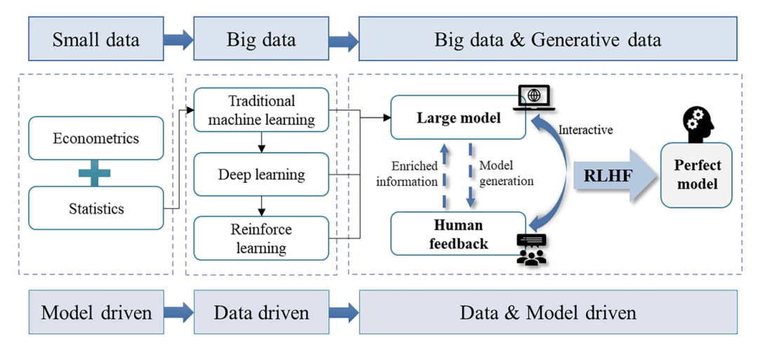 传统经济与金融研究主要依赖实证与实验数据,通过统计计量模型检验理论并进行预测,但在面对日益增长的数据规模、复杂多变的经济环境以及样本稀缺或不可获取的极端事件时,传统方法显现局限。而生成式模型(如GANs、VAEs)能够合成与真实数据高度一致的“虚拟样本”,既可填补数据空白,也可用于模拟难以观测的极端场景,助力风险评估与情景演练。此外,通过人类反馈的强化学习(RLHF),大模型不仅可基于历史数据进行训练,还能在专家持续反馈中优化决策,提升模型解释力与自适应能力。本研究提出的新范式强调在“真实数据+生成数据”双重驱动下,以GAI特性为核心,重塑研究目标与数据体系,并将模型与人类交互过程纳入研究视野,进而更全面地理解复杂经济金融系统。