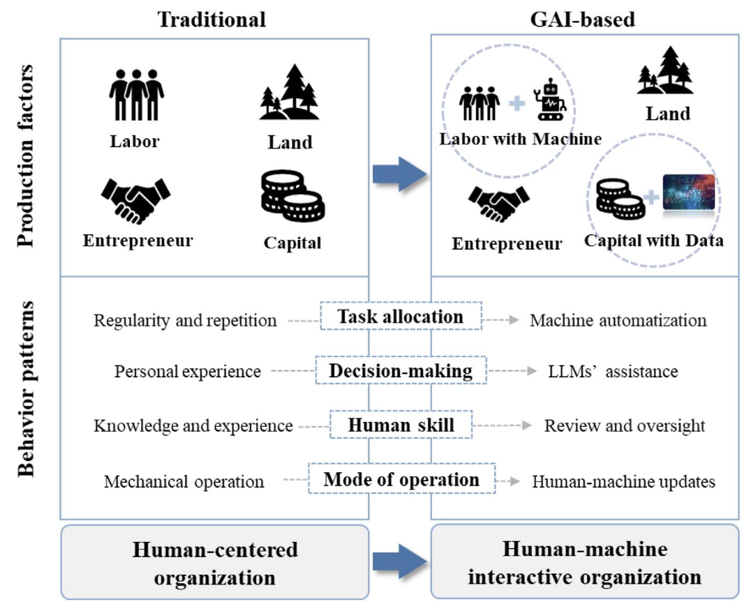 除了传统的“人、企业、政府、市场”等要素,未来研究需关注GAI驱动的机器主体,其自动化程度、学习能力、环境适应性、运算速度及“无情感”特性等,可能引发不同于人类的行为模式和系统反馈。