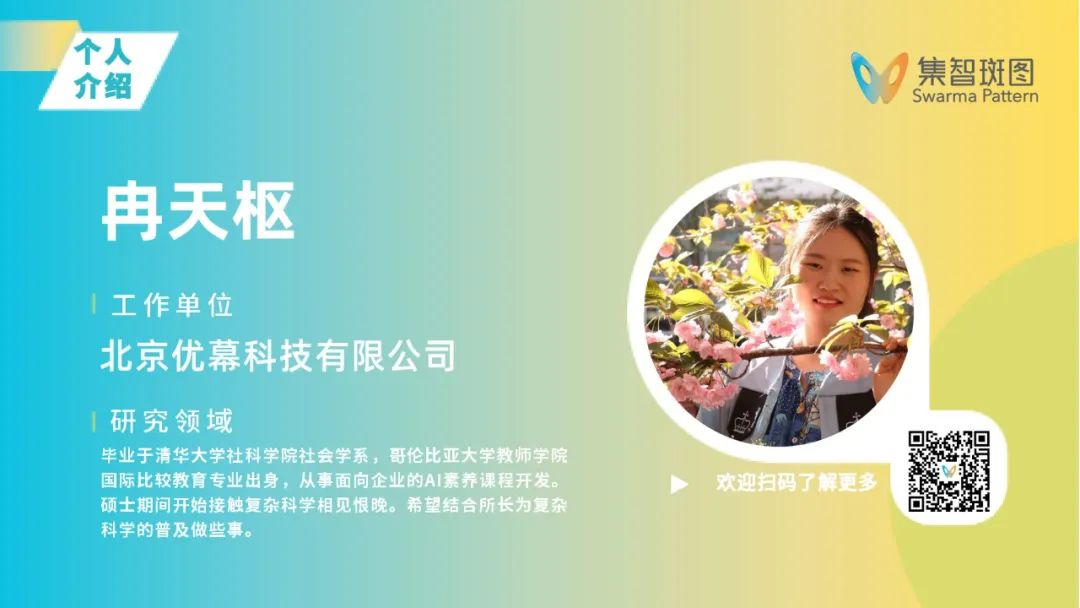 冉天枢,毕业于清华大学社科学院社会学系,哥伦比亚大学教师学院国际比较教育专业出身,现从事面向企业的AI素养课程开发。从硕士期间开始接触复杂科学,相见恨晚。希望结合所长,为复杂科学的普及做些事。
