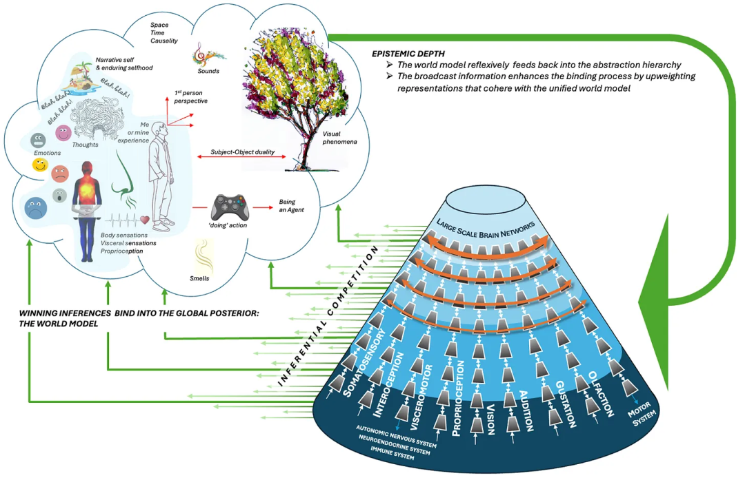 图4:生成认知空间及其反思性分享。此图展示了信息如何通过嵌套贝叶斯绑定被整合进现实模型中。圆锥体代表多层生成模型,最上方的“意识云”代表现实模型的整合结果。该结果被反向传播到下层系统中,用以预测内容与“精度”。这种递归机制使得现实模型具备了“认知自己”的能力。整个循环嵌套在统一的计算结构内,不涉及“心-物”二元论。