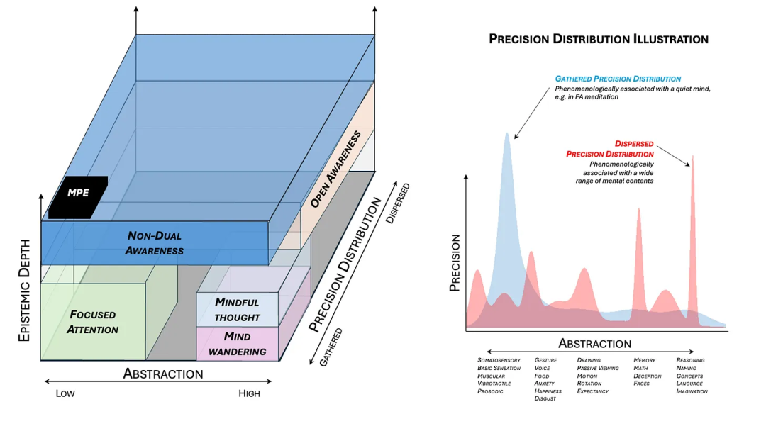 图6展示了冥想状态的三维模型:抽象层级、精度分布和认知深度。不同冥想状态可被定位于不同坐标:从集中注意(低抽象、低认知深度)到开放觉察(高抽象、高深度、精度分散)。而极简体验(Minimal Phenomenal Experience, MPE)则位于认知深度高、抽象性低的位置——这是迷幻体验或深度冥想中常见的“觉知之觉知”。