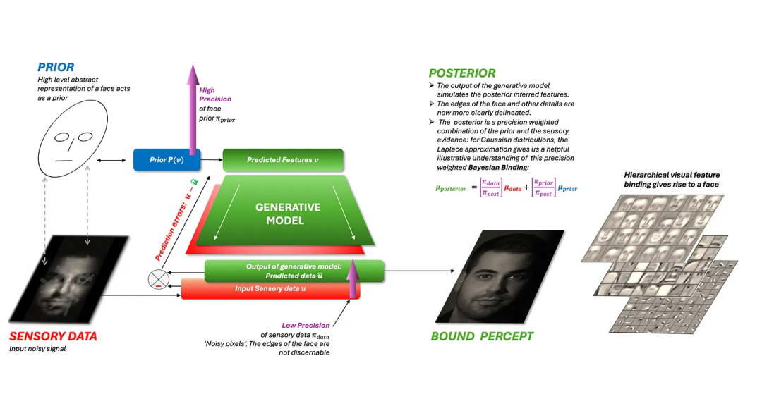 图2:生成面孔知觉的单个对象绑定示例。此图简化地展示了贝叶斯绑定在面部感知背景下的过程。从图中可以看出噪声感官输入如何与先验预期相结合,以生成清晰的后验表征,这都是在一个生成模型下的表现。左侧是低精度的感官输入(模糊人脸),左上角为大脑先验模型。通过生成模型将两者结合,中间生成预测误差,并最终产生右侧清晰的人脸图像。公式展示了精度加权的贝叶斯推理,即后验均值是先验与感官数据的加权平均。图右进一步以黑白图示展示如何从局部视觉特征整合出完整面孔。