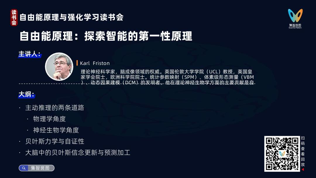 集智俱乐部「自由能原理与强化学习第6期:Karl Friston:意识的物理学——主动推理的顶层逻辑」读书会中,本论文作者之一,理论神经科学家,脑成像领域的权威Karl Friston运用自由能原理,从主动推理的角度提供一个解释,并且通过大脑中贝叶斯信念更新的模拟来详细探讨这些想法,并将其与预测加工以及我们如何对待世界中的可供性联系起来。感兴趣的可以扫码查看视频回放👇