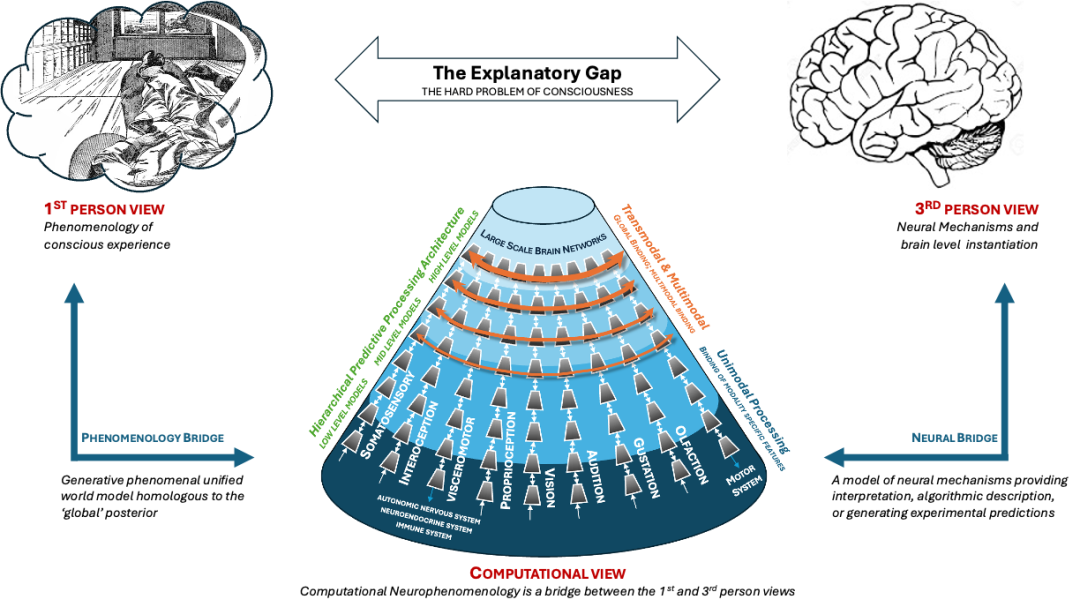 图1:使用计算神经现象学来弥合解释鸿沟。此图说明了神经机制与主观体验之间的解释鸿沟。中间的圆锥体代表“层次化主动推理”,它在第三人称(客观机制)与第一人称(主观体验)之间架起桥梁。该模型通过多层级、精度加权的预测误差最小化,从低层感官输入逐步构建出对世界和自我的完整模型。该模型也体现了“绑定”(binding)现象如何在各层次发生:从特征到物体,再到多模态整合。
